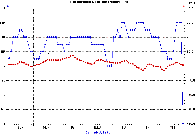 Left axis (blue): Median wind direction. Right axis (red): Average temperature.